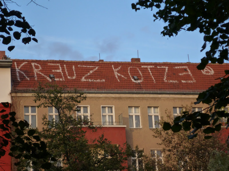 Hier rechts auf dem Dach steht Kreuzkotze, das kann ich jetzt nicht übersetzen. Wir sehen hier viele Protestnoten gegen das Establishment und gegen den Staat in diesem Bezirk, in dem viele Kreative und viele Protestler leben. Also nicht täuschen lassen durch die schönen grünen Bäume am Uferrand, das ist ein ziemlich sehr virulenter Bezirk, Kreuzberg eben.Super, nur die neuköllner Seite hamse unterschlagen, Monsieur.